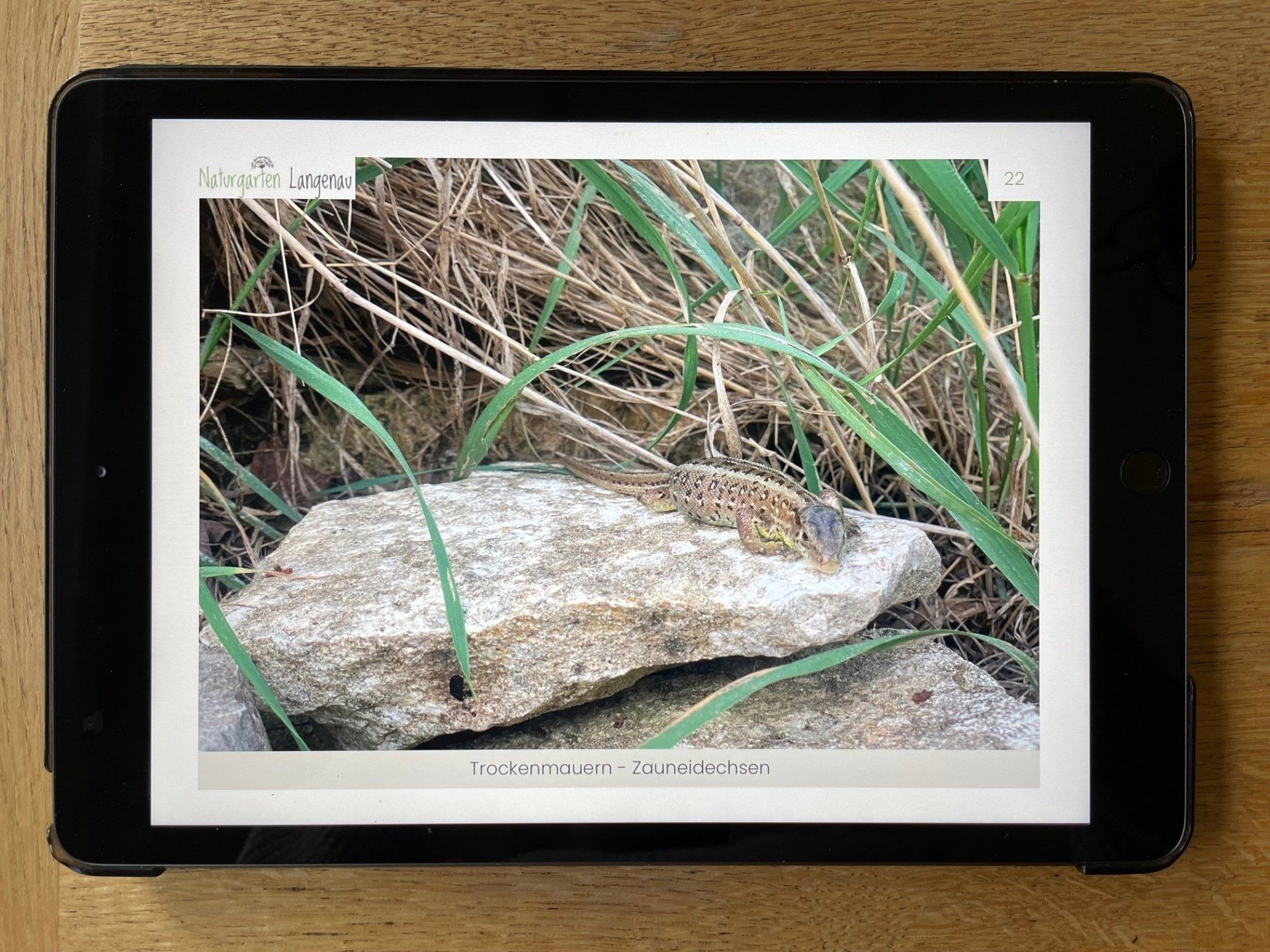 Bild:: Digitale Unterstützung mit dem iPad; Titelbild ganz oben: Naturgarten Langenau von Norden, aufgenommen am 22. Sept. 2022